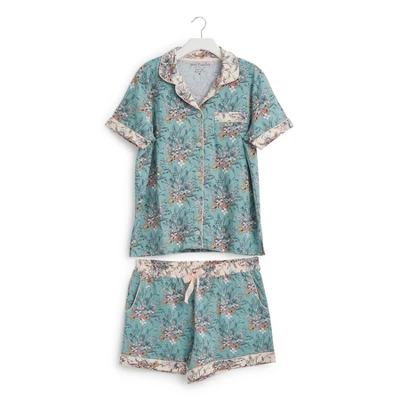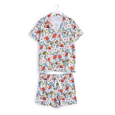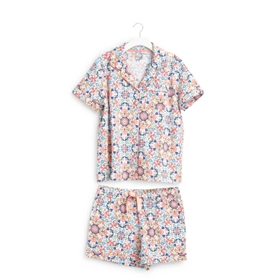 Matching pajama sets make for instant main-character-in-a-Nancy-Meyers-movie vibes. We suggest picking up multiple patterns! Details: 95% cotton, 5% spandex jersey knit. Printed with solid piping trim detail. Top is short sleeved with a button front. Patch pocket. Shorts have two slip pockets. Elastic waist with drawstring. 3 ½” inseam. Care Tips: Machine wash cold, gentle cycle, only non-chlorine bleach when needed; tumble dry low; cool iron, if needed