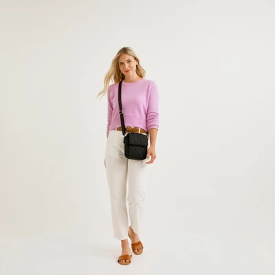 This small crossbody is your go-anywhere sidekick crafted from water-repellent polyester fabric. That’s the kind of versatility we love! Details: Made from quilted, sleek, water-repellent polyester. Exterior features a front flap pocket and a back slip pocket. Interior features a zip pocket and a clip for keys on interior front wall. Zip closure. Care Tips: Spot clean with mild detergent and a soft, damp cloth, rinse thoroughly; lay flat to dry