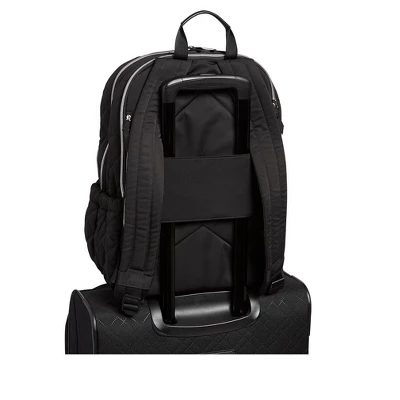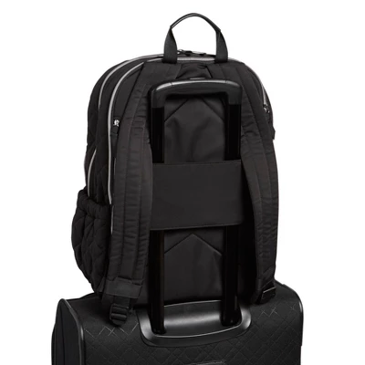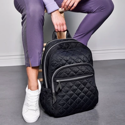 This backpack will get you from point A to point B with ease. The laptop compartment is perfect for work or school, and there are plenty of pockets to take it on a weekend getaway. Details: Made from quilted, sleek, water-repellent polyester. Exterior features two zip pockets and two side slip pockets. Front zip compartment features four slip pockets, three pen slip pockets and an ID window. Main compartment features two mesh slip pockets. Laptop compartment. Trolley sleeve. Padded back and straps. Zip closures. Accommodates up to a 15″ laptop. Capacity 25 L. Care Tips: Spot clean with mild detergent and a soft, damp cloth, rinse thoroughly; lay flat to dry